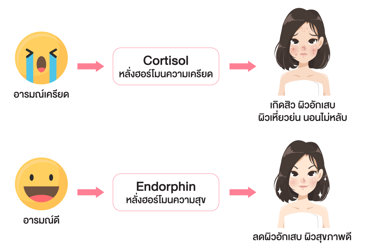 อารมณ์มีผลต่อสุขภาพความงาม หากเราอารมณ์ไม่ดี วิตกกังวล หรือซึมเศร้า สมองก็จะหลั่งฮอร์โมนความเครียด และผลก็จะไปปรากฎที่ผิวของเรา ไม่ว่าจะผิวแห้ง หมองคล้ำ หรือเกิดสิวต่างๆ ในทางตรงกันข้ามหากเราอารมณ์ดีก็จะหลั่งฮอร์โมนแห่งความสุขออกมา ผิวพรรณก็จะเปล่งปลั่ง สดใส สุขภาพดี